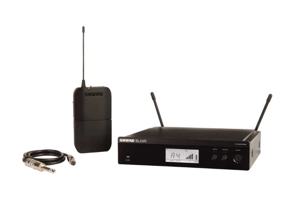 Shure langaton instrumenttijärjestelmä BLX1/WA302 instrumenttikaapelilla ja lähettimellä, sekä BLX4R vastaanottimella.