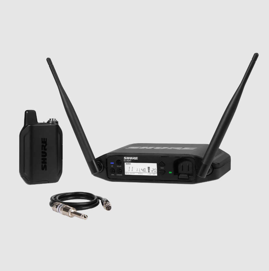 Uusi GLX-D+ Dual Band Wireless Bodypack System sisältää WA302-kitarakaapelin ja pöytävastaanottimen GLXD4+.