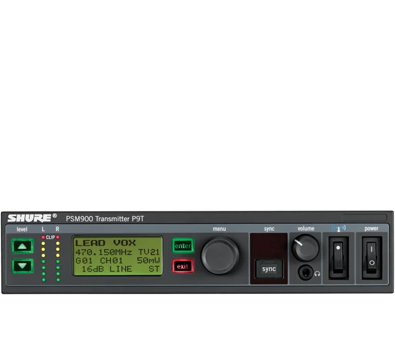 Shure's P9T is a half-rack, wireless transmitter used in conjunction with the P9RA+ Bodypack receiver as part of the PSM 900 Wireless Personal Monitor System.