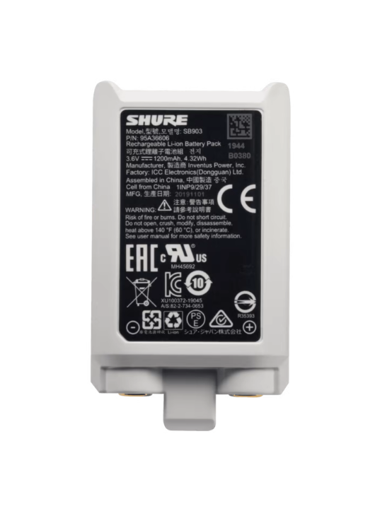 Ladattavat SB903 litiumioniakut mahdollistavat reaaliaikaisen akun käyttöiän ja akun kuntoominaisuudet SLXD Digital Wireless -lähettimille.
