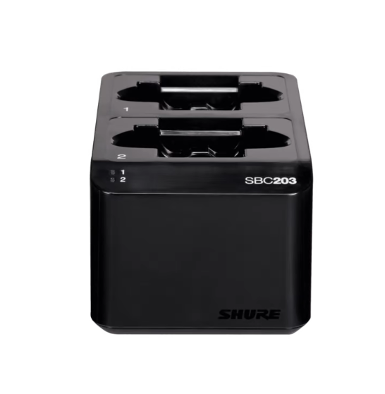 Kaksoistelakkalatausasema lataa kahta SB903-litiumioniakkua lähettimessä tai sen ulkopuolella.