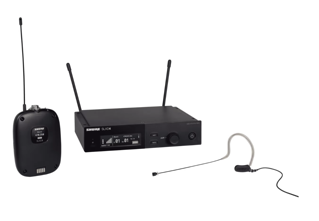 Shure langaton headsetjärjestelmä SLXD1/MX153B lähettimellä ja pääpantamikrofonilla, sekä SLXD4 vastaanottimella.