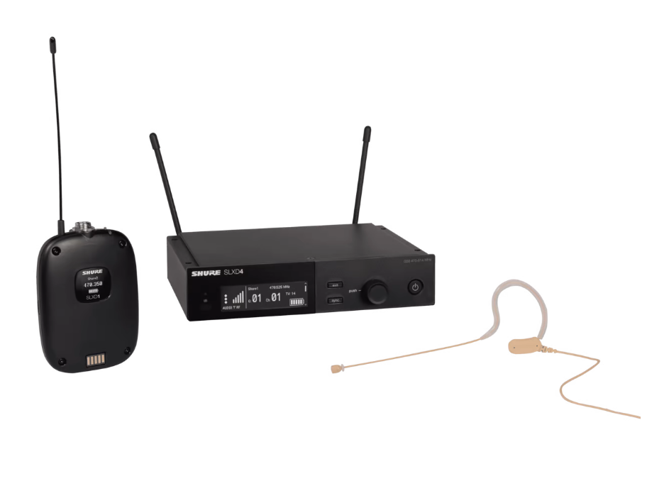 Shure langaton headsetjärjestelmä SLXD1/MX153T lähettimellä ja pääpantamikrofonilla, sekä SLXD4 vastaanottimella.