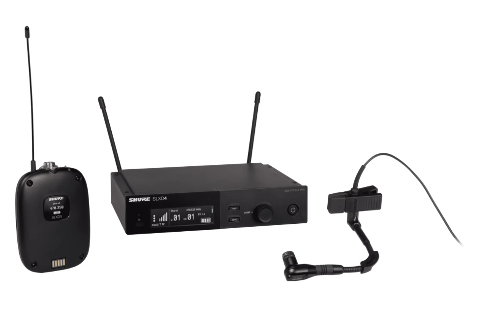 Shure langaton instrumenttijärjestelmä SLXD1/B98H vyölähettimellä ja instrumenttimikrofonilla, sekä SLXD4 vastaanottimella.