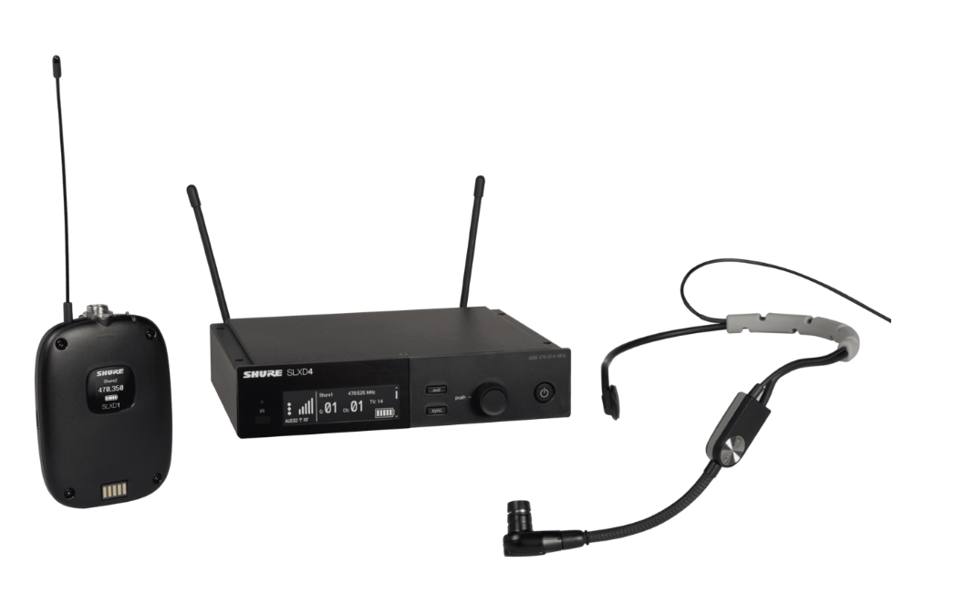 Shure langaton headsetjärjestelmä SLXD1/SM35 vyölähettimellä ja pääpantamikrofonilla, sekä SLXD4 vastaanottimella.