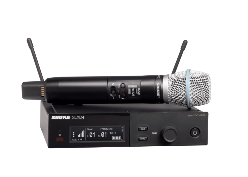 Shure langaton käsimikrofonijärjestelmä SLXD2/Beta 87A käsilähettimellä, sekä SLXD4 vastaanottimella.