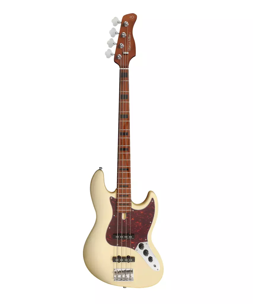Perinnebasso moderneilla yksityiskohdilla SIRE Marcus Miller V5 Vintage White on leppärunkoinen, sulavasoittoinen, passiivielektroniikalla varustettu J-basso.