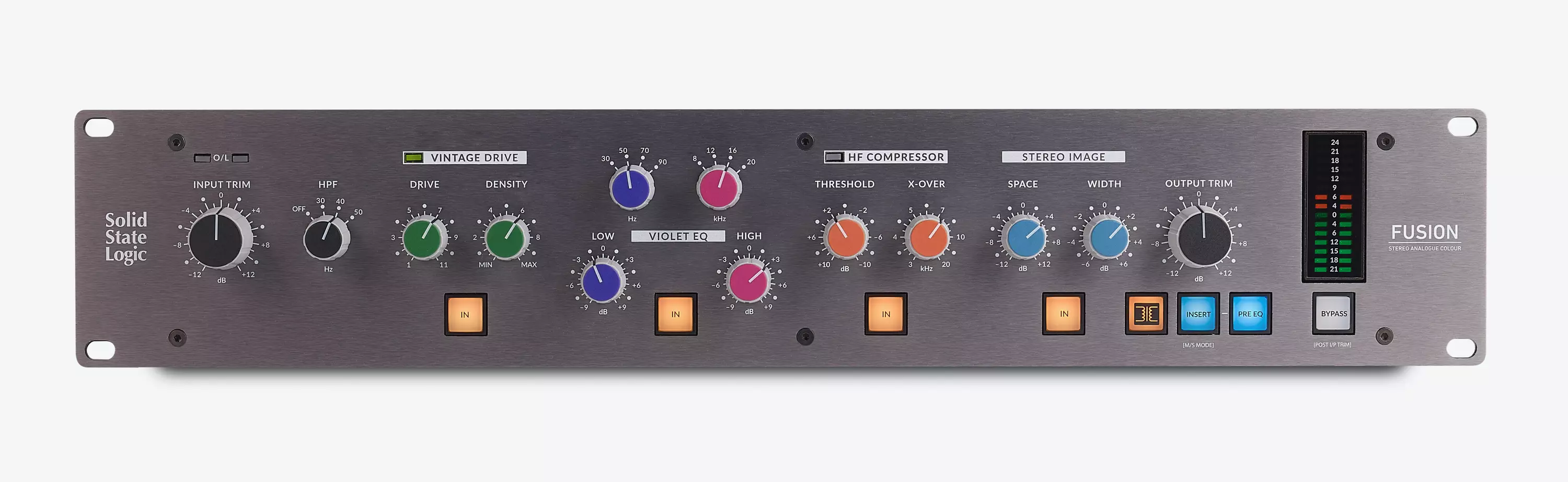 SSL Fusion on täysin analoginen stereo-masterprosessori monipuoliseen signaaliprosessointiin.