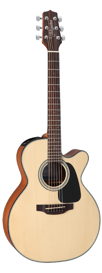 The Taka-mini GX18CE-NS is a 3/4 size guitar with a full size voice. Featuring custom designed bracing, a solid spruce top in a scaled down version of the famous Takamine NEX body style, it will definitely inspire to extend your playing time. Its solid spruce top, Mahogany back and sides and laurel fingerboard along with the NEX-style body gives it a sweet voice complimenting vocals perfectly. The TP4T preamp with built-in tuner makes this very cool guitar equally ideal for amplified live performances.