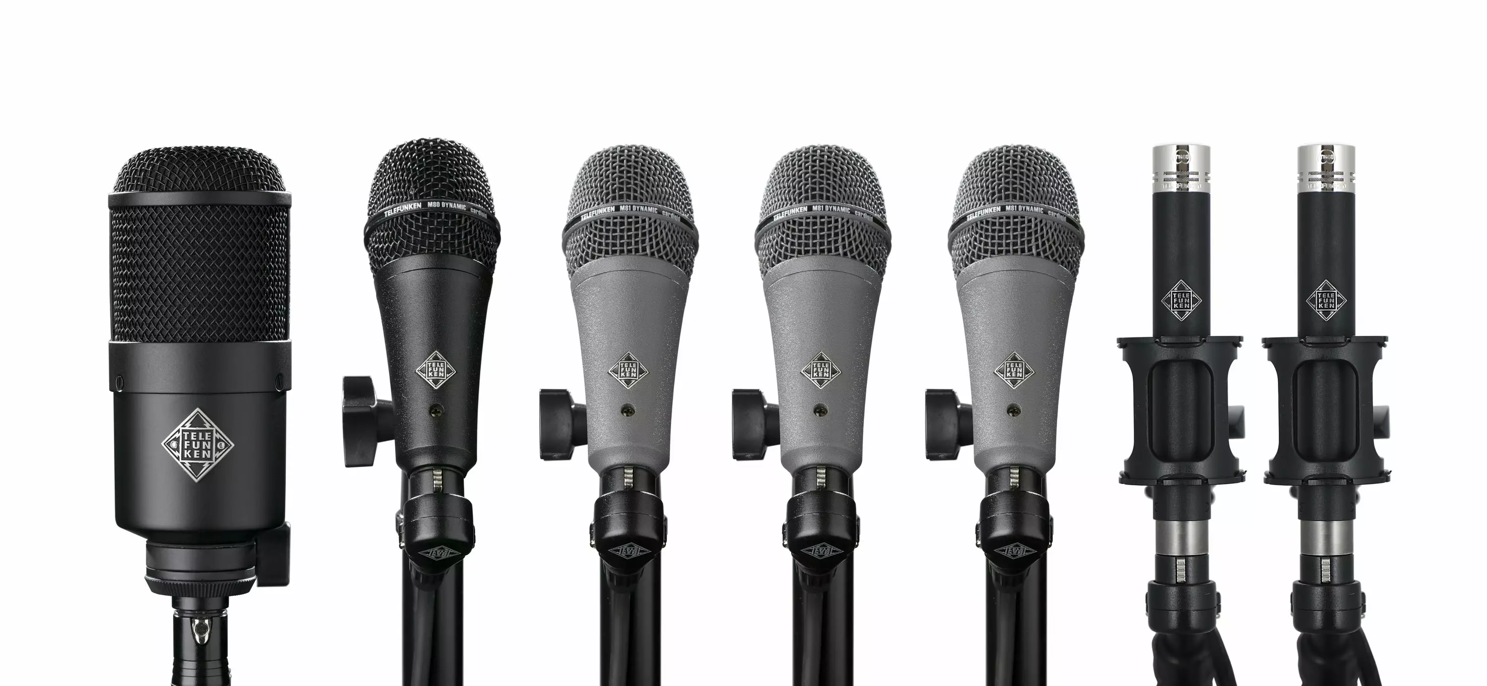TELEFUNKEN Elektroakustik has assembled the three unique voices of its TEC Award winning Dynamic Series microphone line, in combination with two matched small diaphragm FET condensers, and packaged them as the 7-microphone DC7 Drum Pack for drum recording and live performance applications. Each microphone set consists of the M82 handling kick drum duties, the M80-SH on snare, the M81-SH for toms, and the M60 FET Cardioid for cymbals or overheads. The DC7 ships in the heavy-duty hard shell HC87 flight case and include multiple drum mounts (M782, M784 and M785) and an SGMC-5R five-meter XLR cable with a right angle female connector for each microphone in the set.